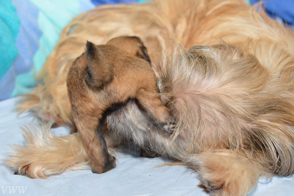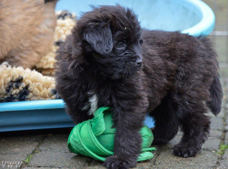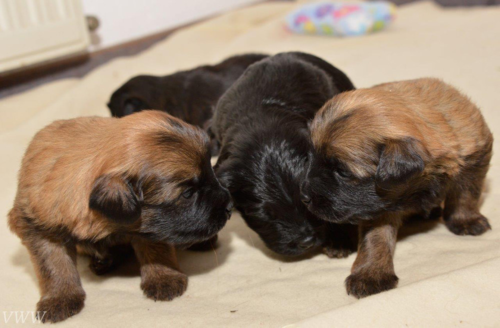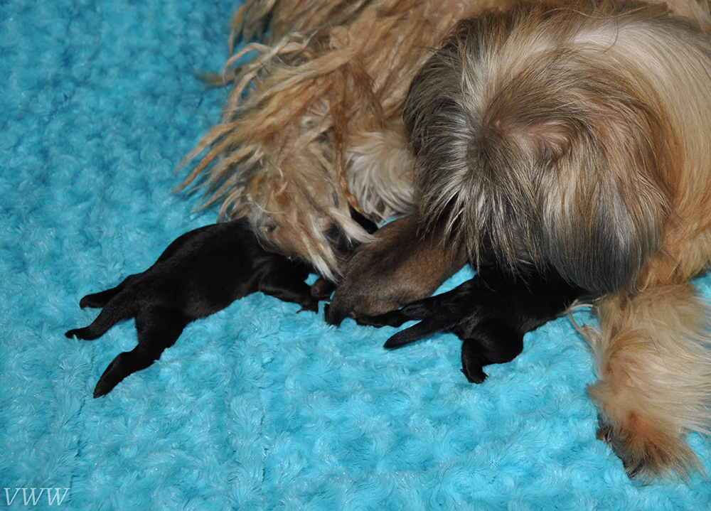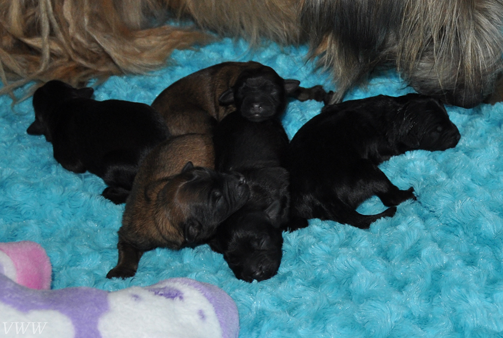 Es sind 3 Hündinnen (2 schwarze und 1 fauve) und 2 Rüden (1 schwarzer und 1 fauver). Die Geburtsgewichte lagen zwischen 270g und 320 g. Vater der Welpen ist Ginster vom Wissener Wald. Die Rüden erhielten die Namen Juglandis und Juniperus. Die Hündinnen heißen Jasmin, Jonquille und Jupiterblume. Akelei kümmert sich rührend um die Minis. Für uns ist es das erste Mal, dass wir zwei Würfe gleichzeitig aufziehen - wir freuen uns auf dieses Aufgabe.
