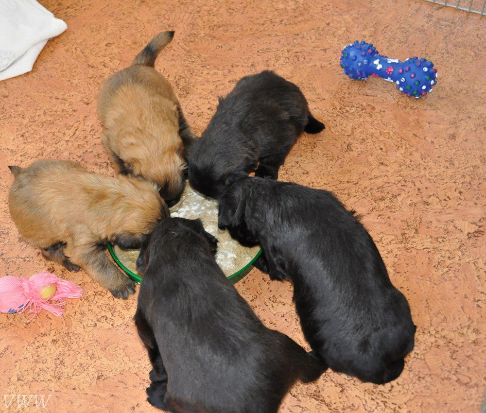 Unsere 5 Wuseln sind rege unterwegs. Mit den 3 kleinen Verwandten vertragen sie sich super. Der Welpenbrei wird gern genommen und Mama Akelei erfährt so ein wenig Entlastung. Nun werden die ersten Besucher erwartet.
