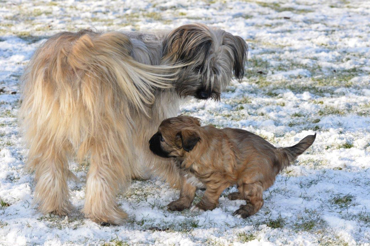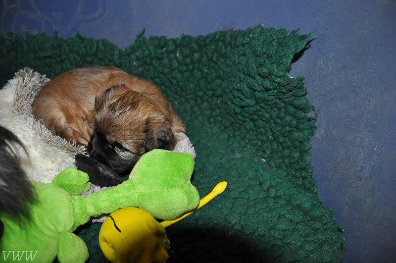 Unser Löwenzahn ist nun schon 5 Wochen alt, inzwischen gibt es neben Mamas Milch auch leckeren Welpenbrei. Auch wenn der Größenunterschied zu den "K's" schon recht groß ist klappt das mit dem gemeinsam Spiele ganz gut. Ebby geht in ihrer Mutterrolle auf, was uns sehr freut.