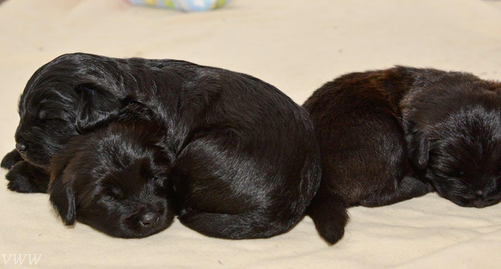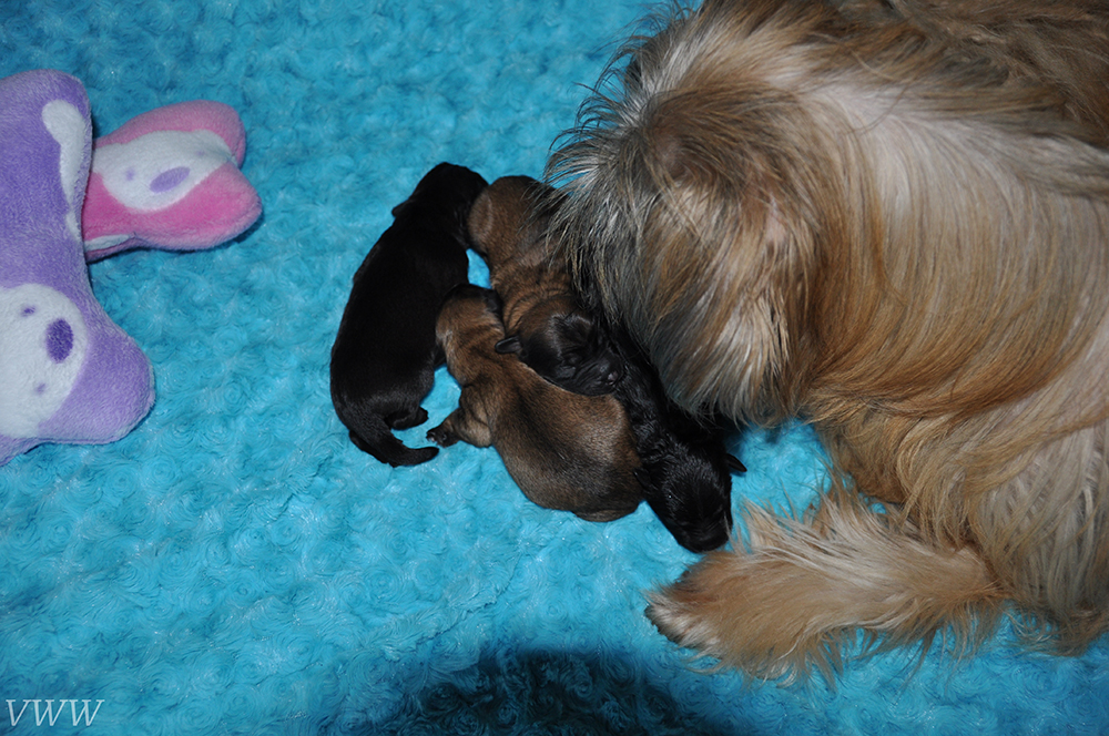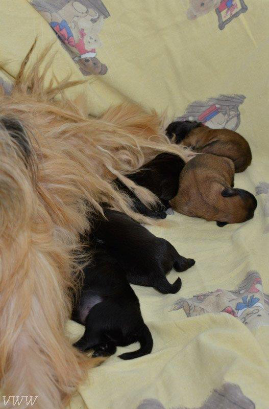 Es sind 3 Hündinnen (2 schwarze und 1 fauve) und 2 Rüden (1 schwarzer und 1 fauver). Die Geburtsgewichte lagen zwischen 270g und 320 g. Vater der Welpen ist Ginster vom Wissener Wald. Die Rüden erhielten die Namen Juglandis und Juniperus. Die Hündinnen heißen Jasmin, Jonquille und Jupiterblume. Akelei kümmert sich rührend um die Minis. Für uns ist es das erste Mal, dass wir zwei Würfe gleichzeitig aufziehen - wir freuen uns auf dieses Aufgabe.