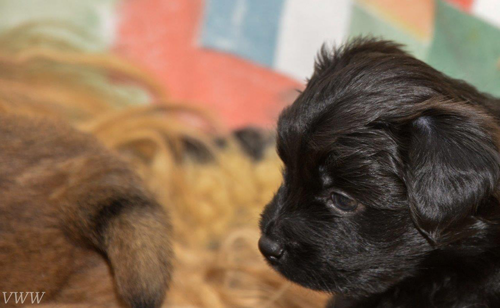 Unsere fünf Minis haben erfolgreich an dem Anstieg ihrer Gewichtskurve gearbeitet. Seit der 2. Lebenswoche haben sie ihre Augen geöffnet. Langsam nehmen sie die Gestalt kleiner Hunde an, auf ihren vier Pfoten sind sie schon sehr flink und geschickt unterwegs, die Geschwister werden zum Spielen entdeckt und das erste zaghafte „Wau“ wurde auch schon von sich gegeben, der erstaunte Gesichtsausdruck – oh, war ich das- ist leider mit Worten nicht zu beschreiben. Unsere Akelei ist eine tolle Hundemama, beide „Mädels“ machen einen tollen Job.