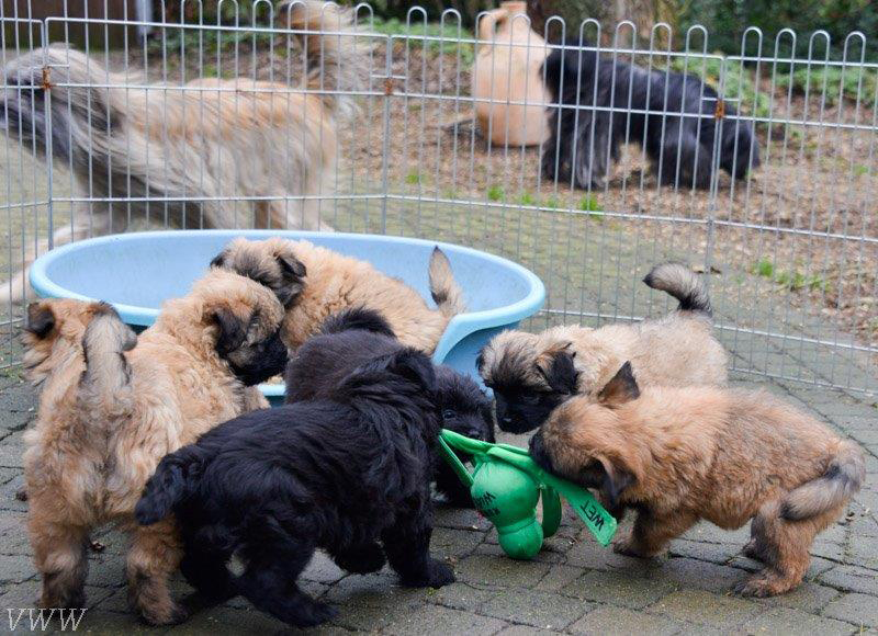 Unsere 5 Wuseln sind rege unterwegs. Mit den 3 kleinen Verwandten vertragen sie sich super. Der Welpenbrei wird gern genommen und Mama Akelei erfährt so ein wenig Entlastung. Nun werden die ersten Besucher erwartet.